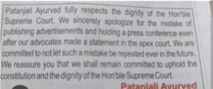 Just before the Supreme Court hearing, Patanjali Ayurved issued an apology in major newspapers, emphasizing their deep respect for the court and their commitment to avoiding similar mistakes in the future. In their advertisement, Patanjali expressed sincere respect for the Supreme Court and apologized for errors made in publishing ads and conducting press conferences, despite assurances from their legal counsel. They pledged their dedication to avoiding such mistakes in the future.