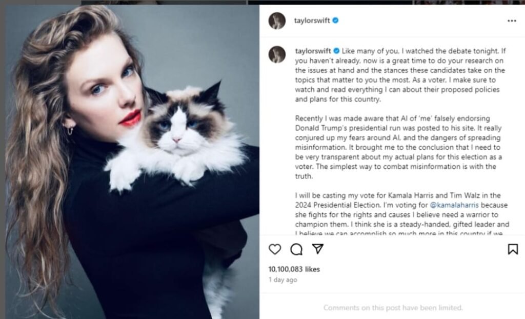 She also told the reason for her support after weeks of speculation on her political leanings: Trump trying to fool people into believing he had her support on the basis of AI generated image. “Recently I was made aware that AI of ‘me’ falsely endorsing Donald Trump’s presidential run was posted to his site. It really conjured up my fears around AI, and the dangers of spreading misinformation. It brought me to the conclusion that I need to be very transparent about my actual plans for this election as a voter. The simplest way to combat misinformation is with the truth,” she wrote.